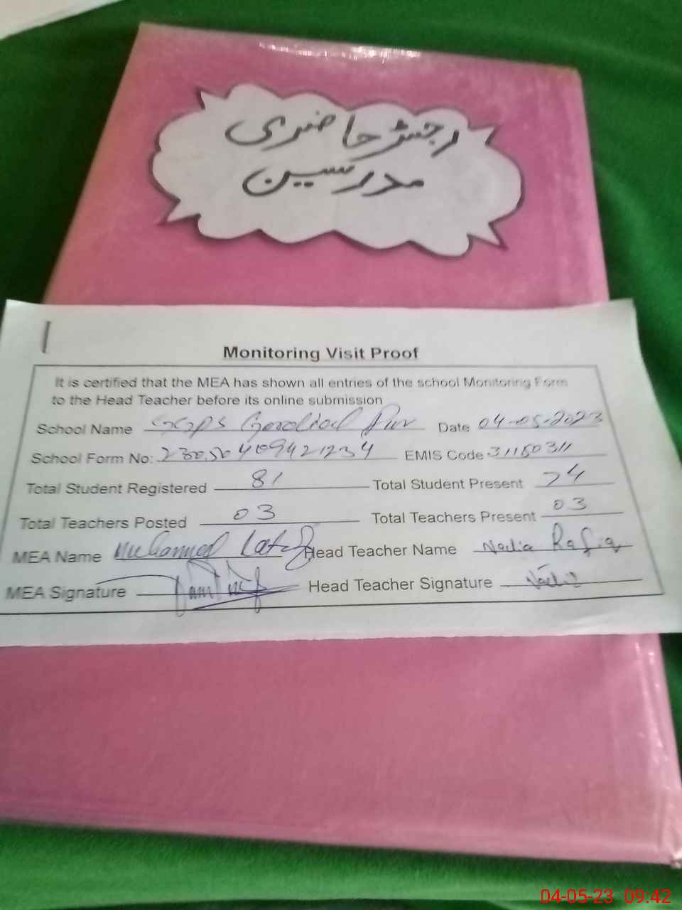 | Attendance Register | Head Teacher | MEA with School | Visit Proof |