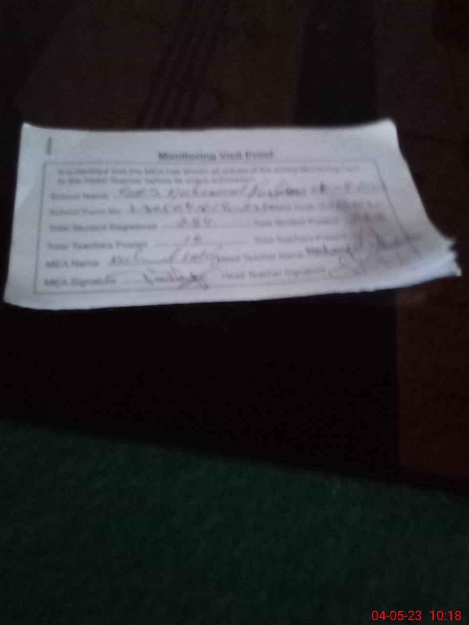 | Attendance Register | Head Teacher | MEA with School | Visit Proof |
