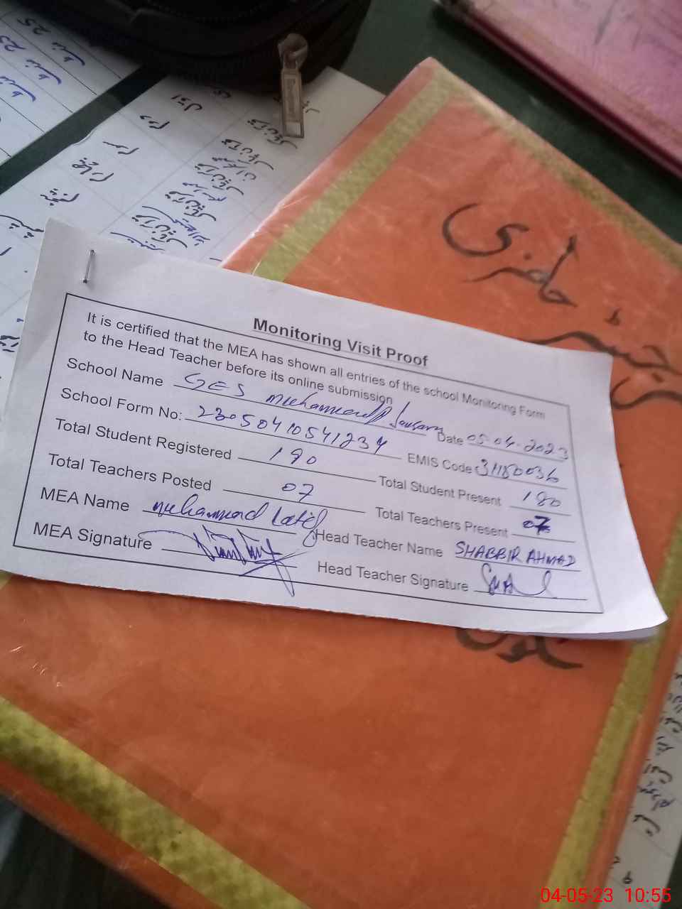 | Attendance Register | Head Teacher | MEA with School | Visit Proof |