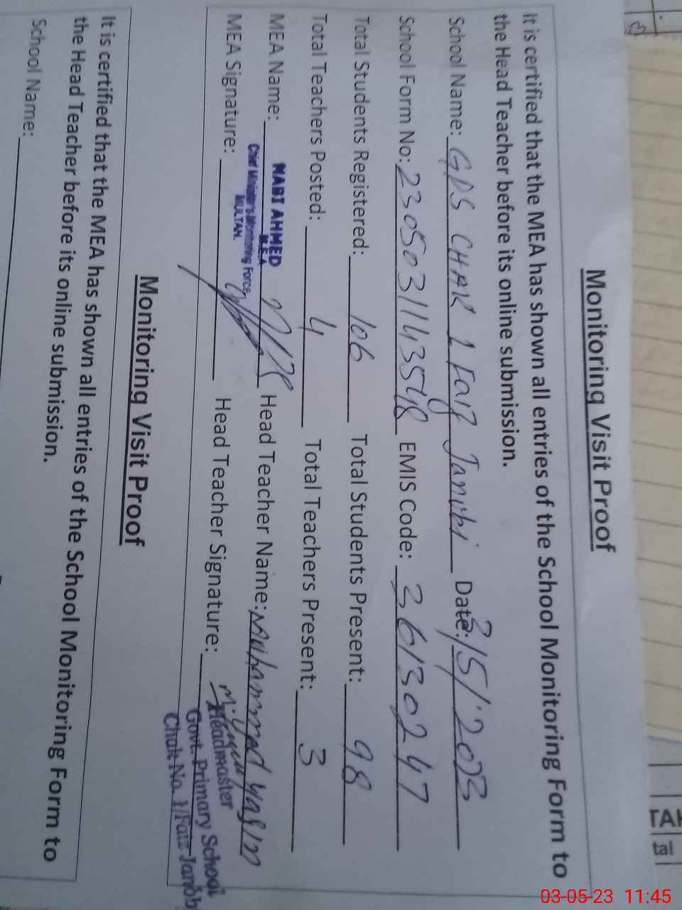 | Attendance Register | Head Teacher | MEA with School | Visit Proof |