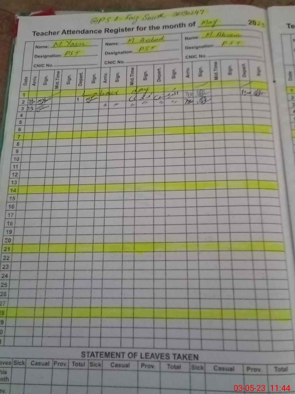 | CNIC | Full Name | Designation | R/C | Absence During Last Calender Month |