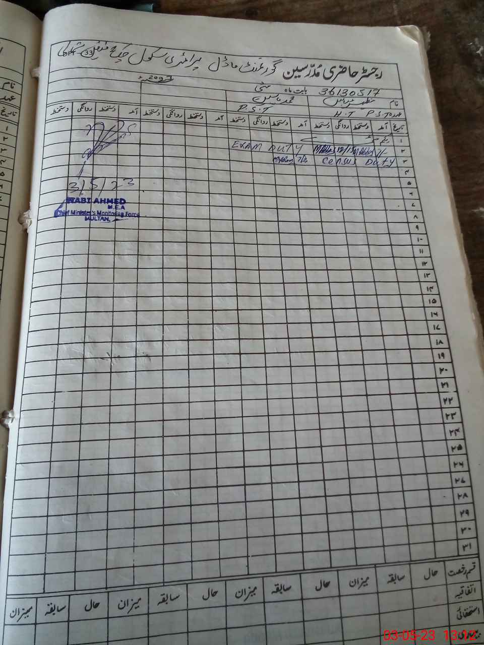 | CNIC | Full Name | Designation | R/C | Absence During Last Calender Month |
