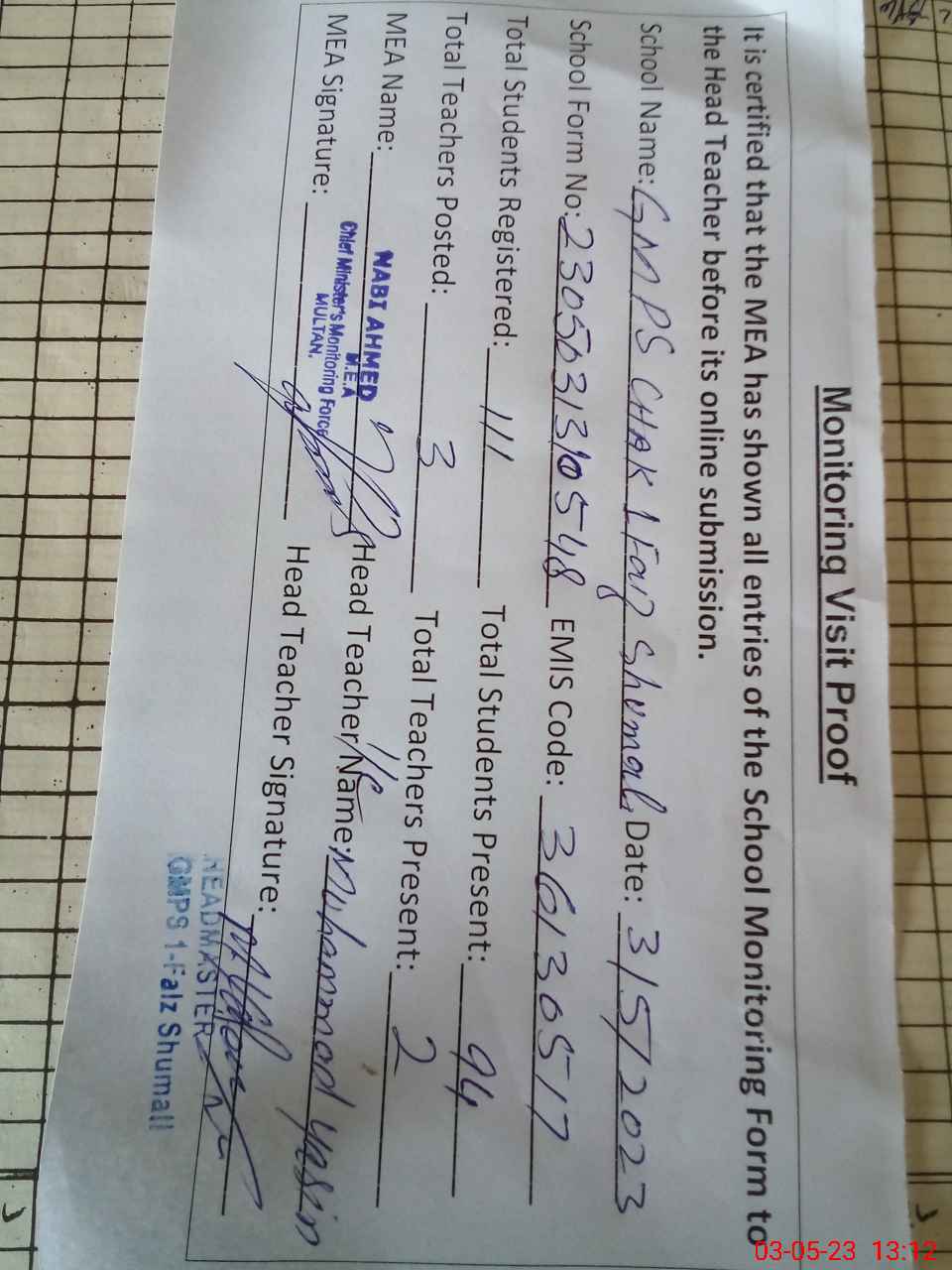 | Attendance Register | Head Teacher | MEA with School | Visit Proof |