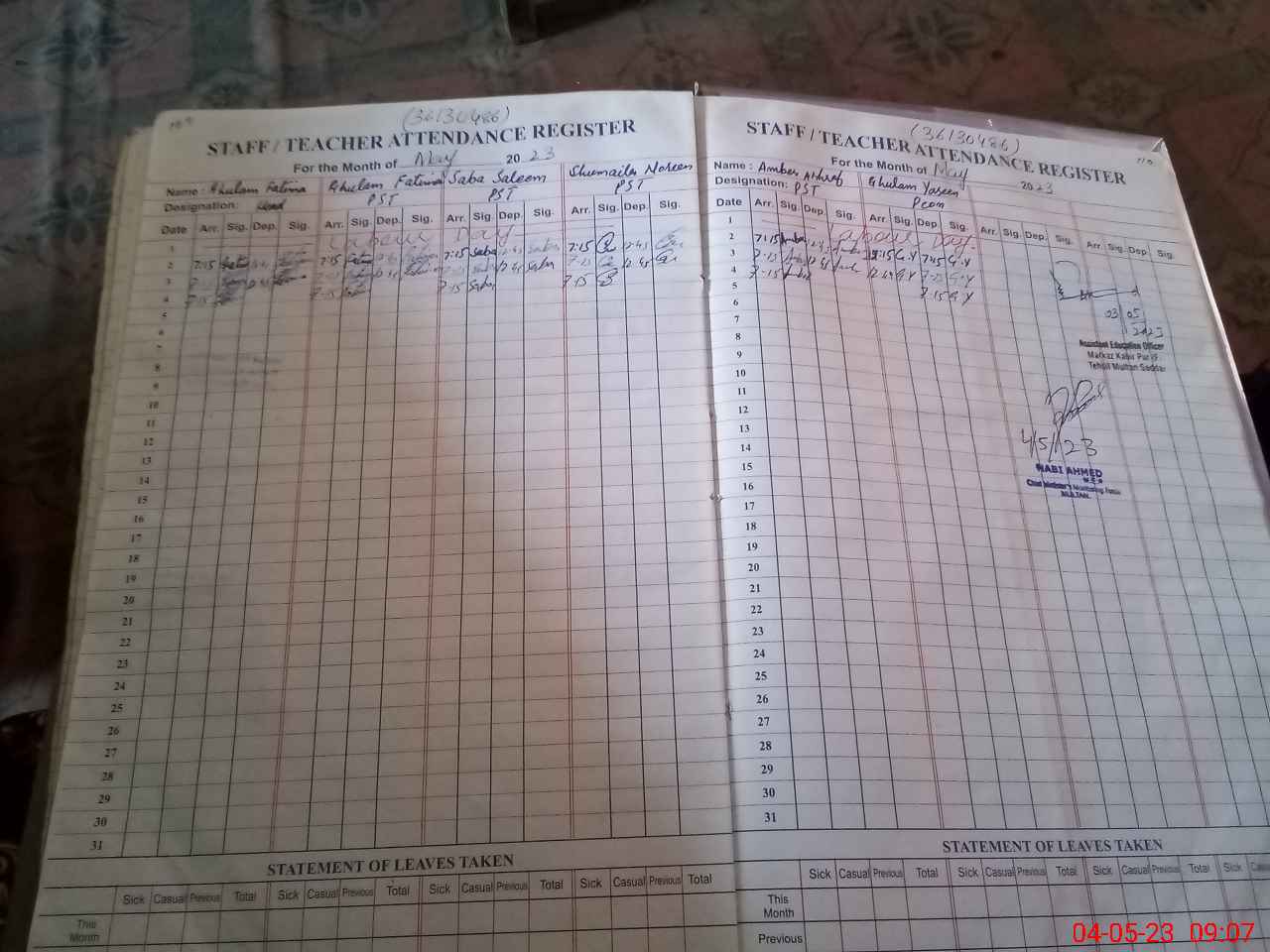 | Remarks (Use Separate Page if Required): Teacher Amber Ashraf PST absent due to temporary duty order or approved Leave application is not available in the school and first time teacher attendance Mark in the attendance register and teacher not available in school | |||||
