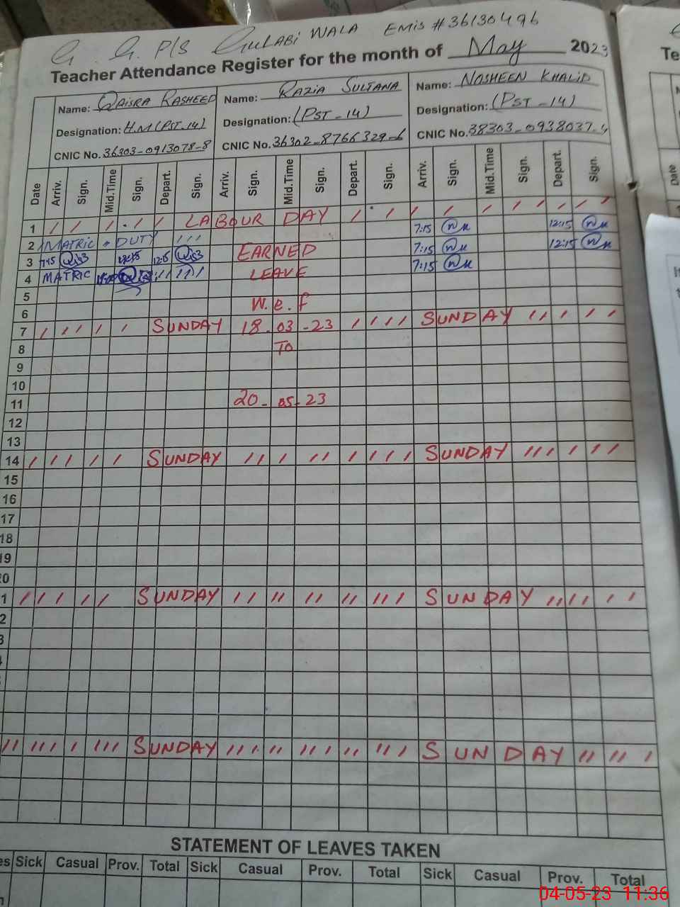 | CNIC | Full Name | Designation | R/C | Absence During Last Calender Month |