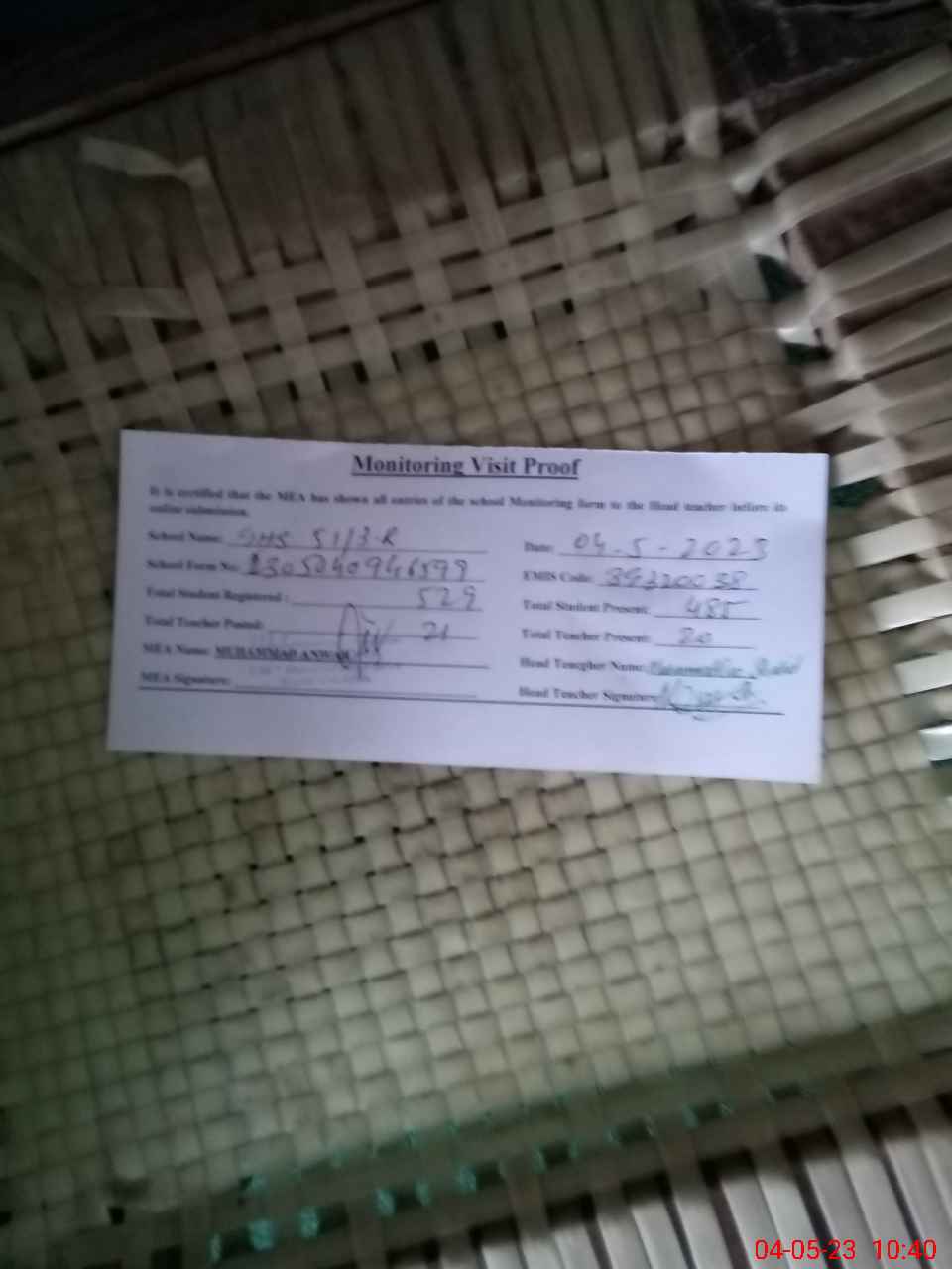 | Attendance Register | Head Teacher | MEA with School | Visit Proof |