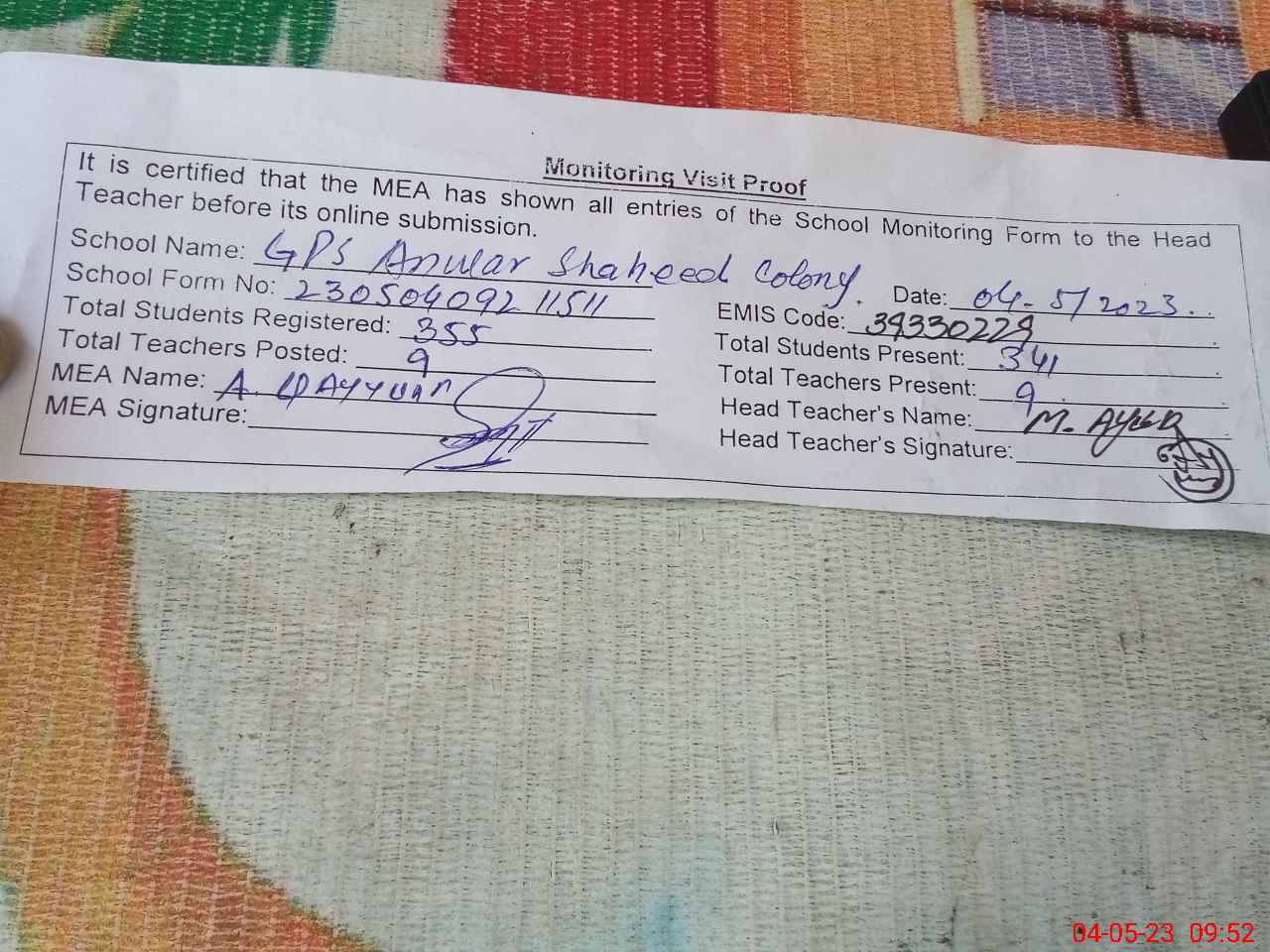 | EMIS Code: 39330229 | Name of School: GPS ANWAR SHAHEED COLONY | |||
