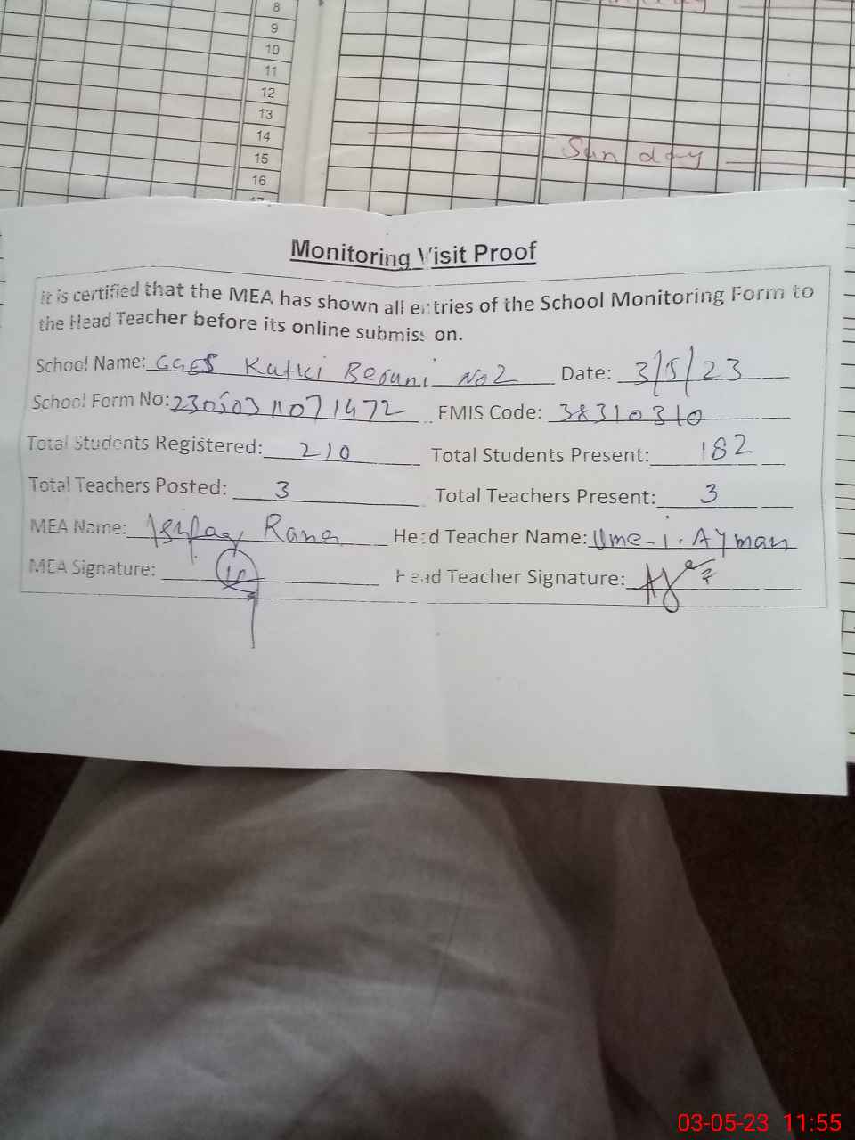 | Attendance Register | Head Teacher | MEA with School | Visit Proof |