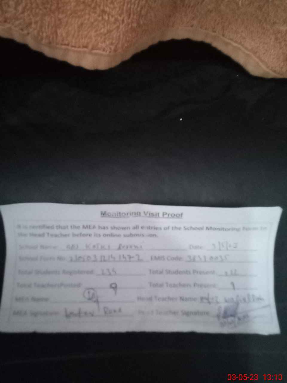 | Attendance Register | Head Teacher | MEA with School | Visit Proof |
