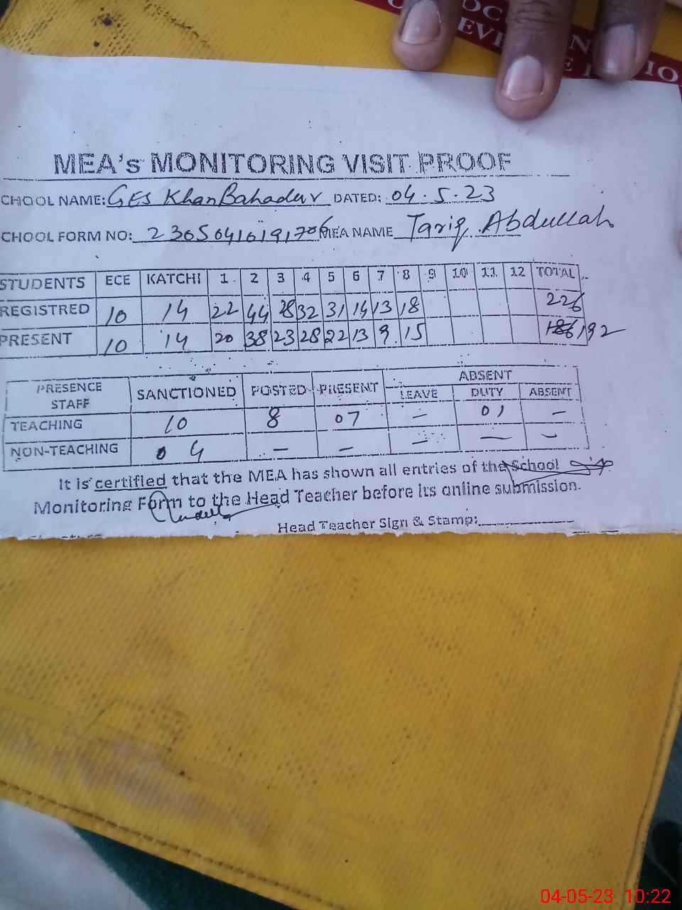 | Attendance Register | Head Teacher | MEA with School | Visit Proof |