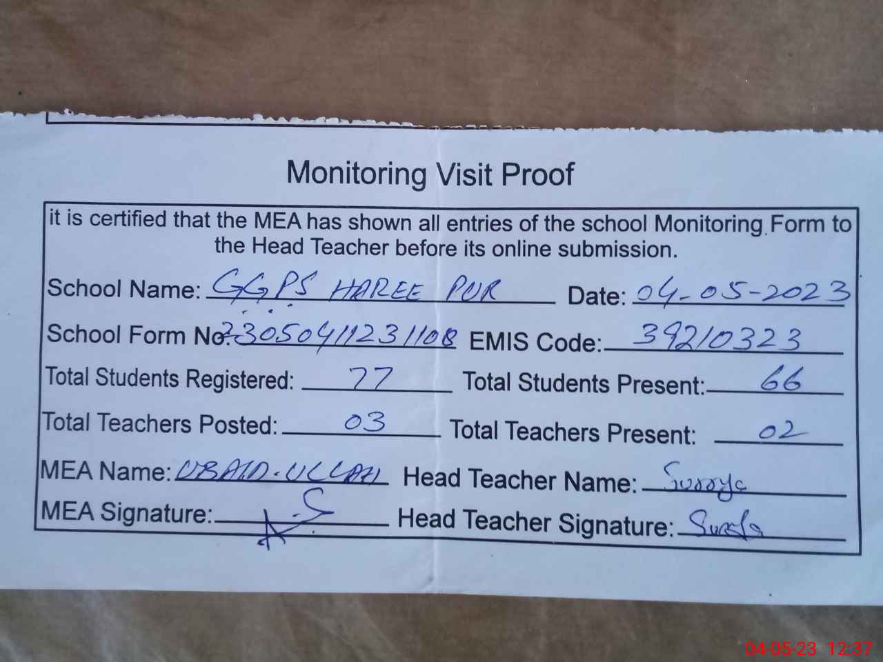 | Attendance Register | Head Teacher | MEA with School | Visit Proof |