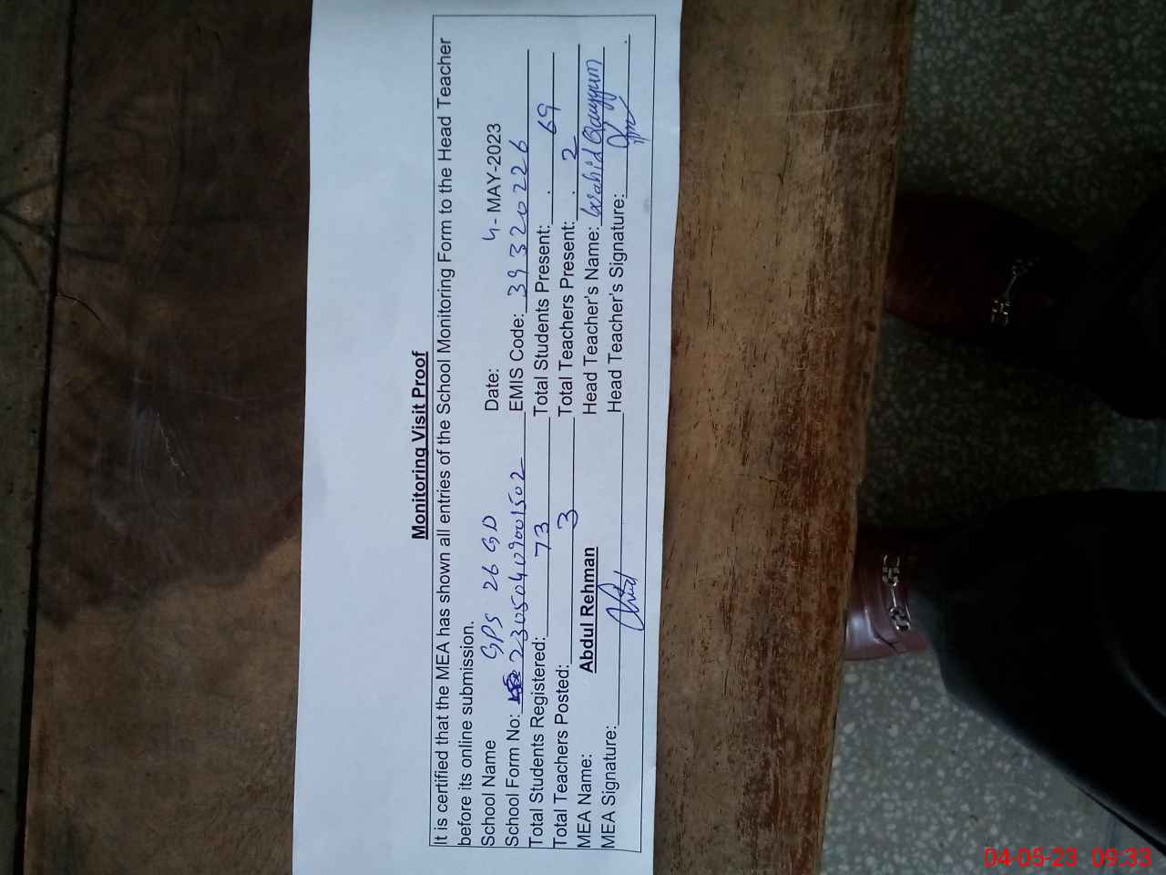 | Attendance Register | Head Teacher | MEA with School | Visit Proof |