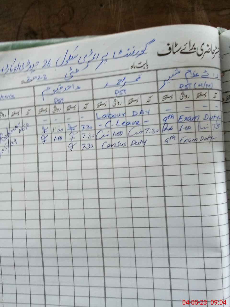 | 35**** | Ra**** Gh**** Sh**** Kh**** | PST | Regular | 0 | 0 | 0 | 0 | 0 | 0 | 0 | 0 | 0 | Exam Duty |