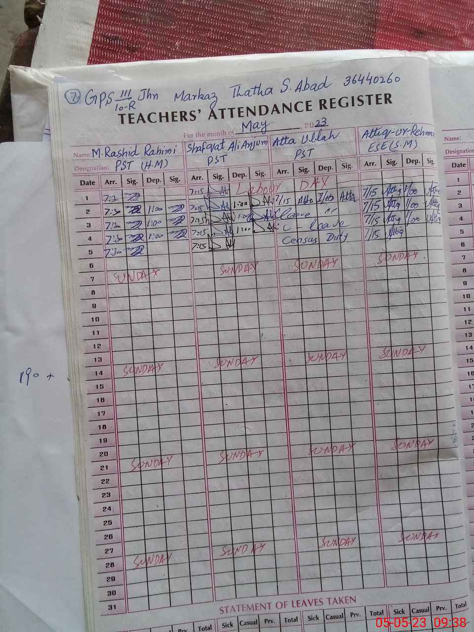 | CNIC | Full Name | Designation | R/C | Absence During Last Calender Month |