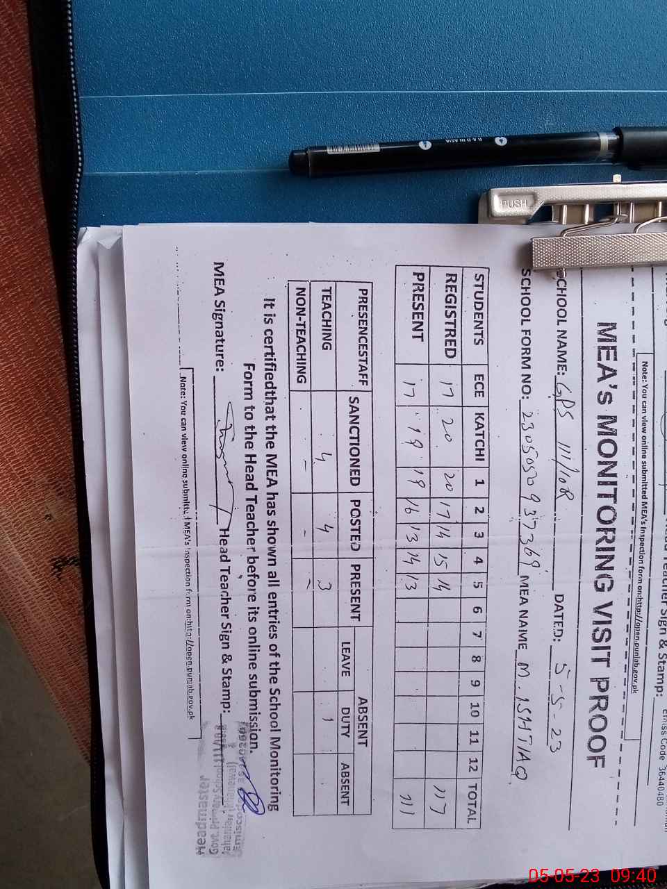 | Attendance Register | Head Teacher | MEA with School | Visit Proof |