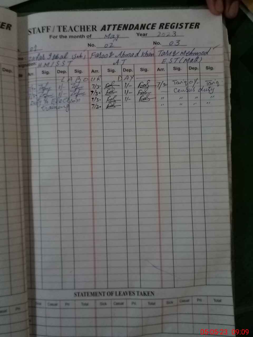 | Remarks (Use Separate Page if Required): STUDENTS ATTENDANCE LIST OF PREVIOUS SESSION PST ZAIB UN NISA MARKED ON MATERNITY LEAVE WHEREAS HER LEAVE STILL NOT SANCTIONED | |||||
