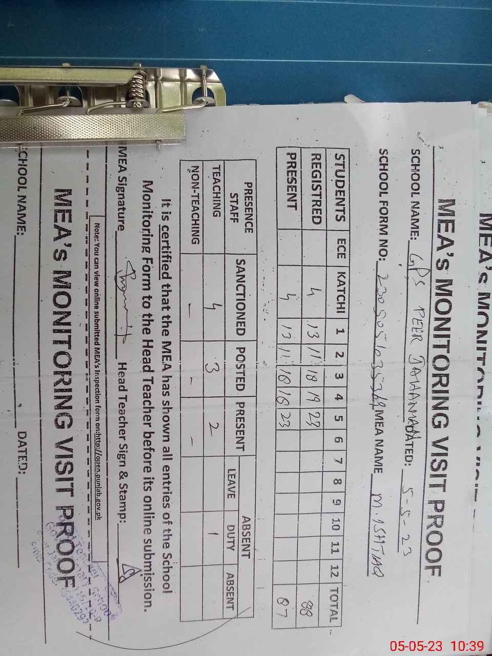 | Attendance Register | Head Teacher | MEA with School | Visit Proof |