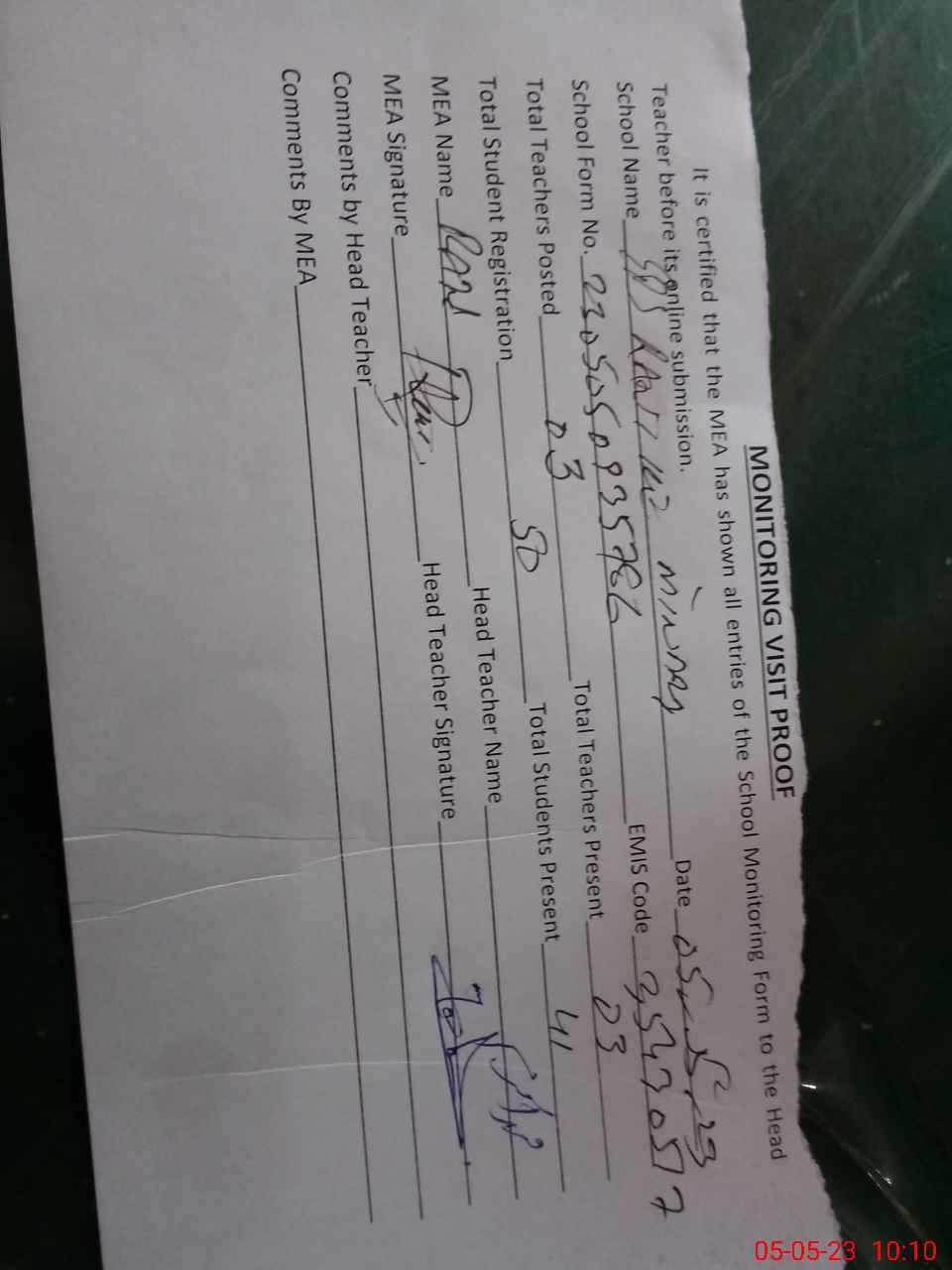 | Attendance Register | Head Teacher | MEA with School | Visit Proof |