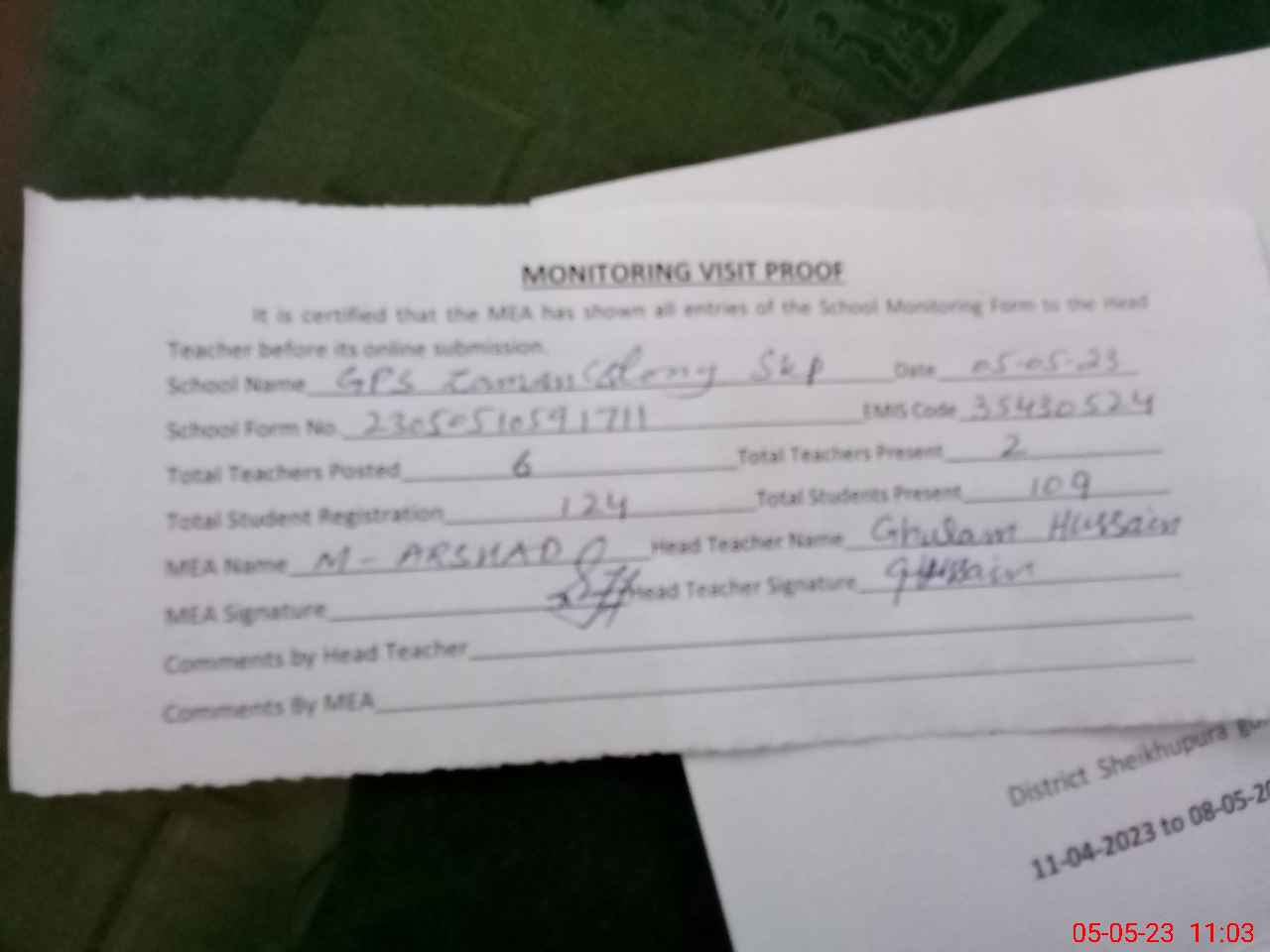 | Attendance Register | Head Teacher | MEA with School | Visit Proof |