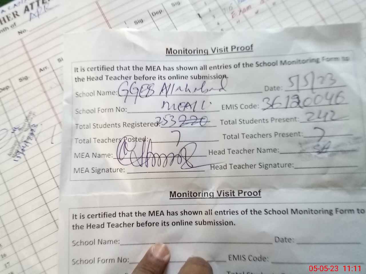 | Attendance Register | Head Teacher | MEA with School | Visit Proof |