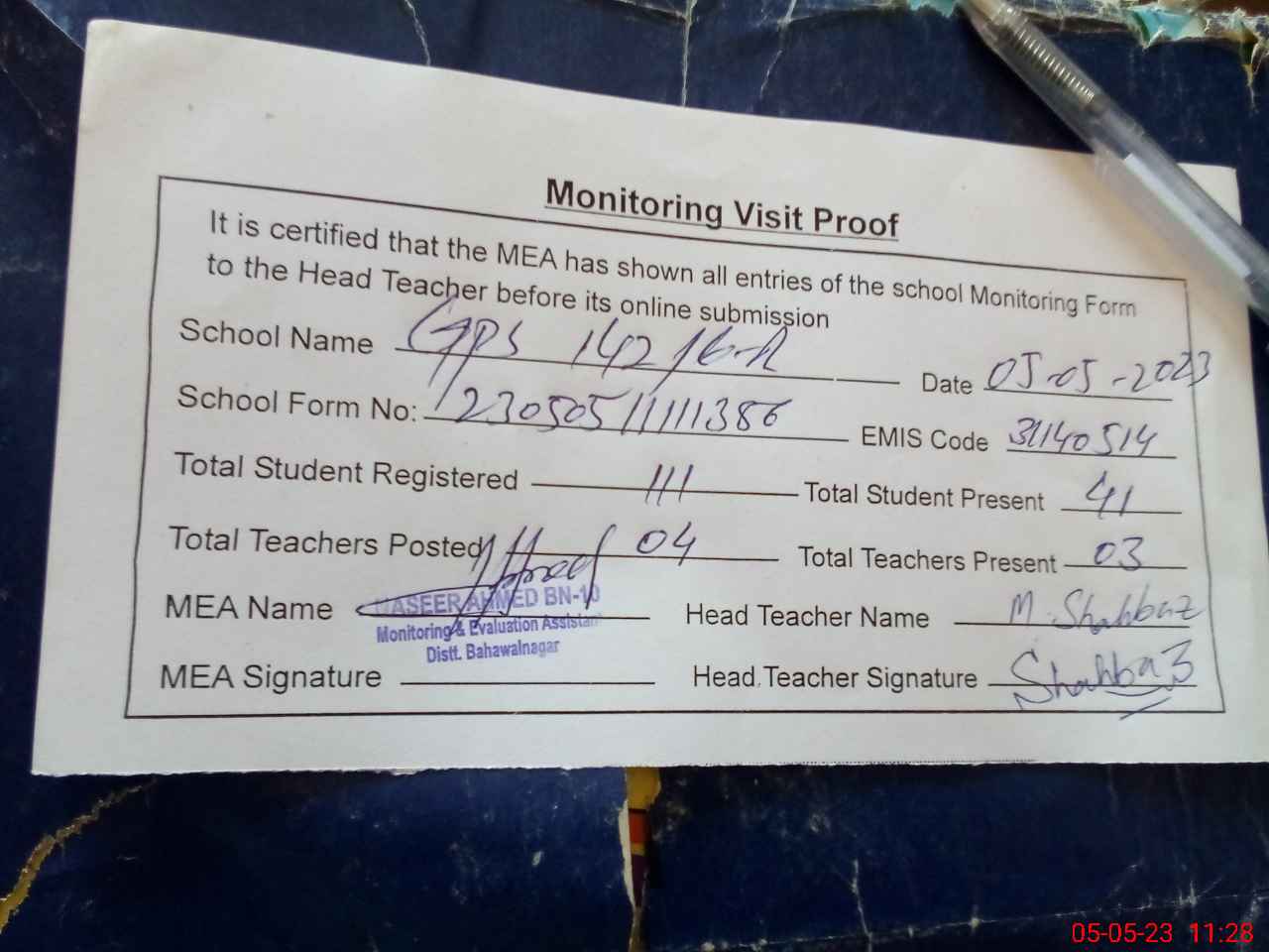 | Attendance Register | Head Teacher | MEA with School | Visit Proof |