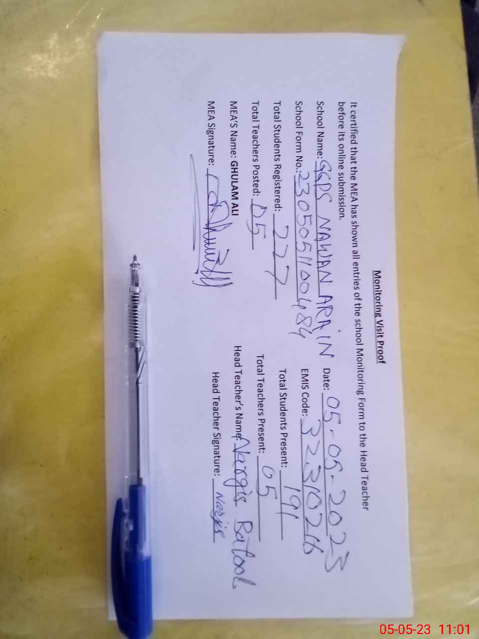 | Attendance Register | Head Teacher | MEA with School | Visit Proof |