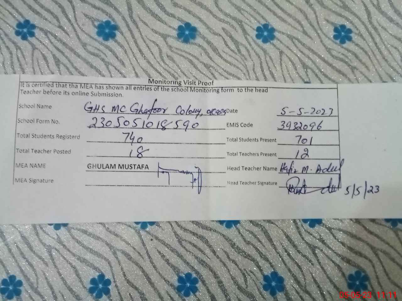 | EMIS Code: 39320966 | Name of School: GHS MC GHAFOOR COLONY OKARA | |||