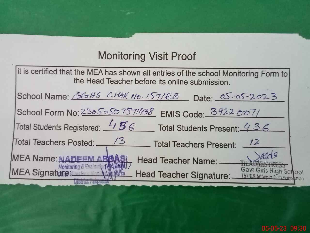 | Attendance Register | Head Teacher | MEA with School | Visit Proof |