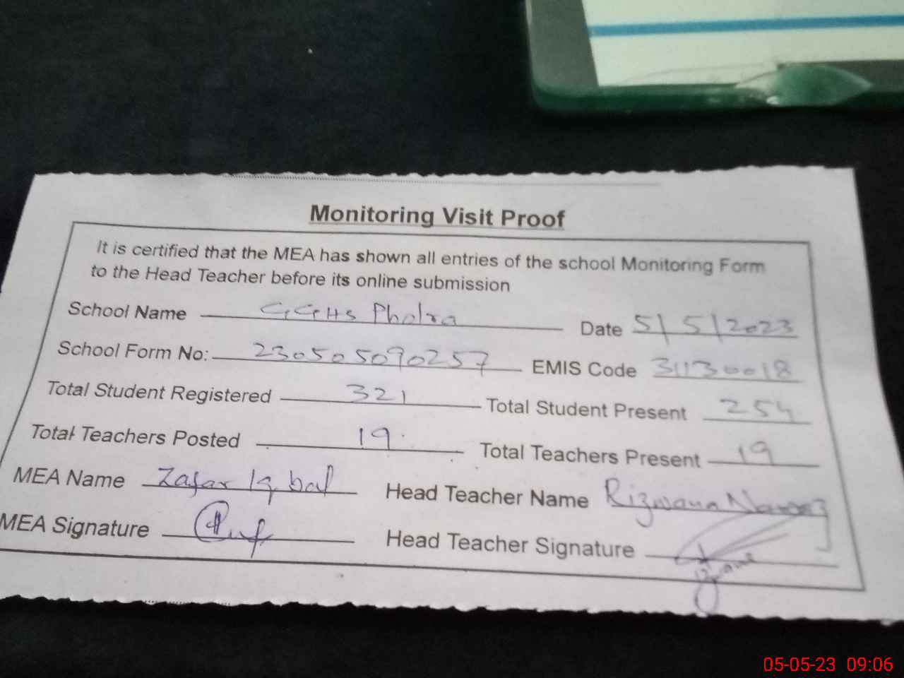 | Attendance Register | Head Teacher | MEA with School | Visit Proof |
