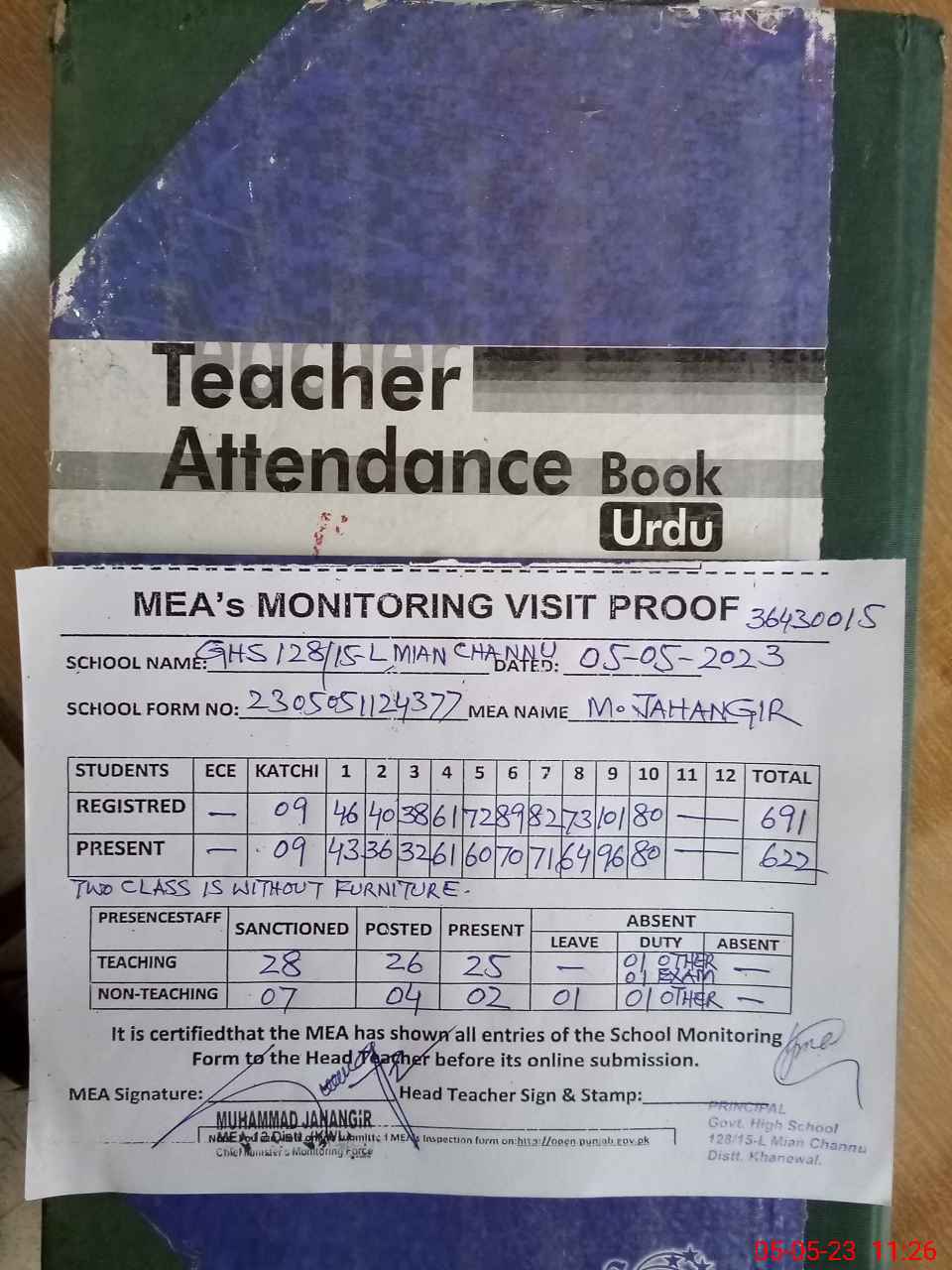 | Attendance Register | Head Teacher | MEA with School | Visit Proof |