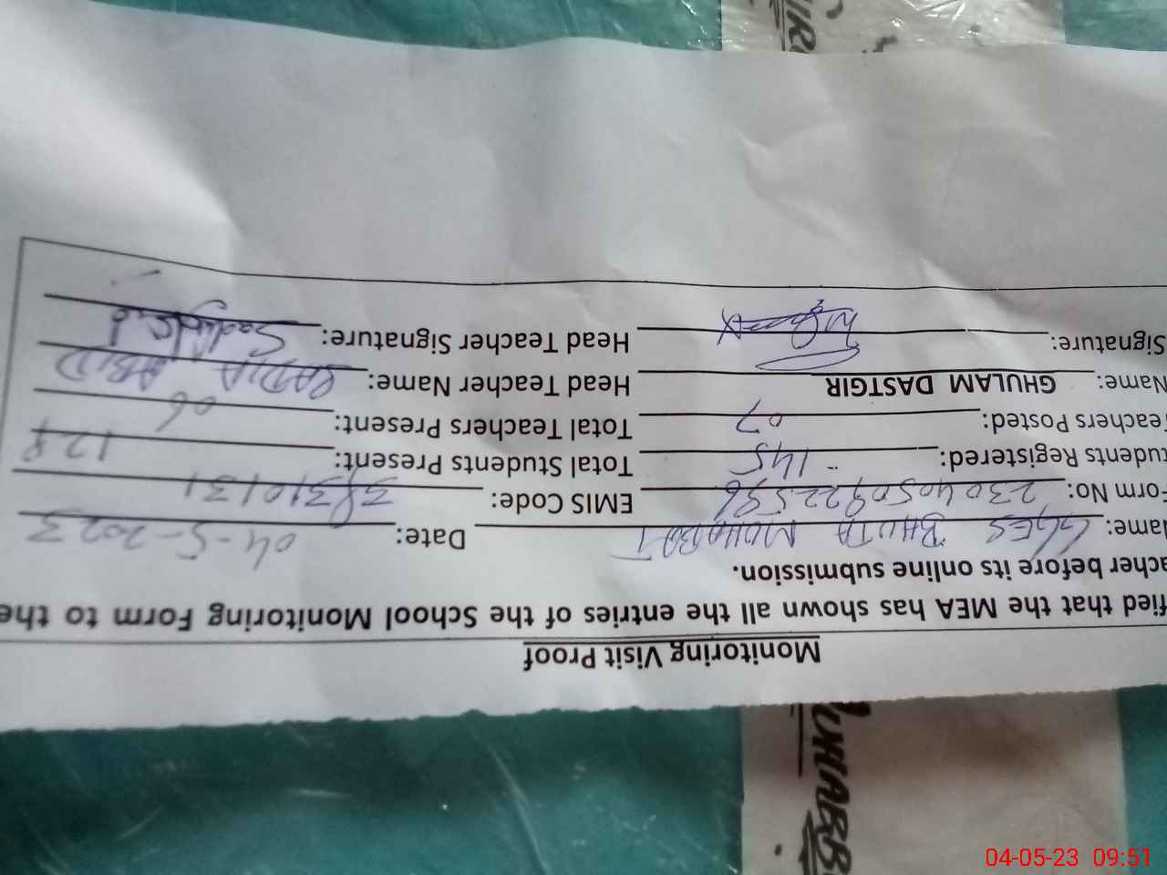 | Attendance Register | Head Teacher | MEA with School | Visit Proof |