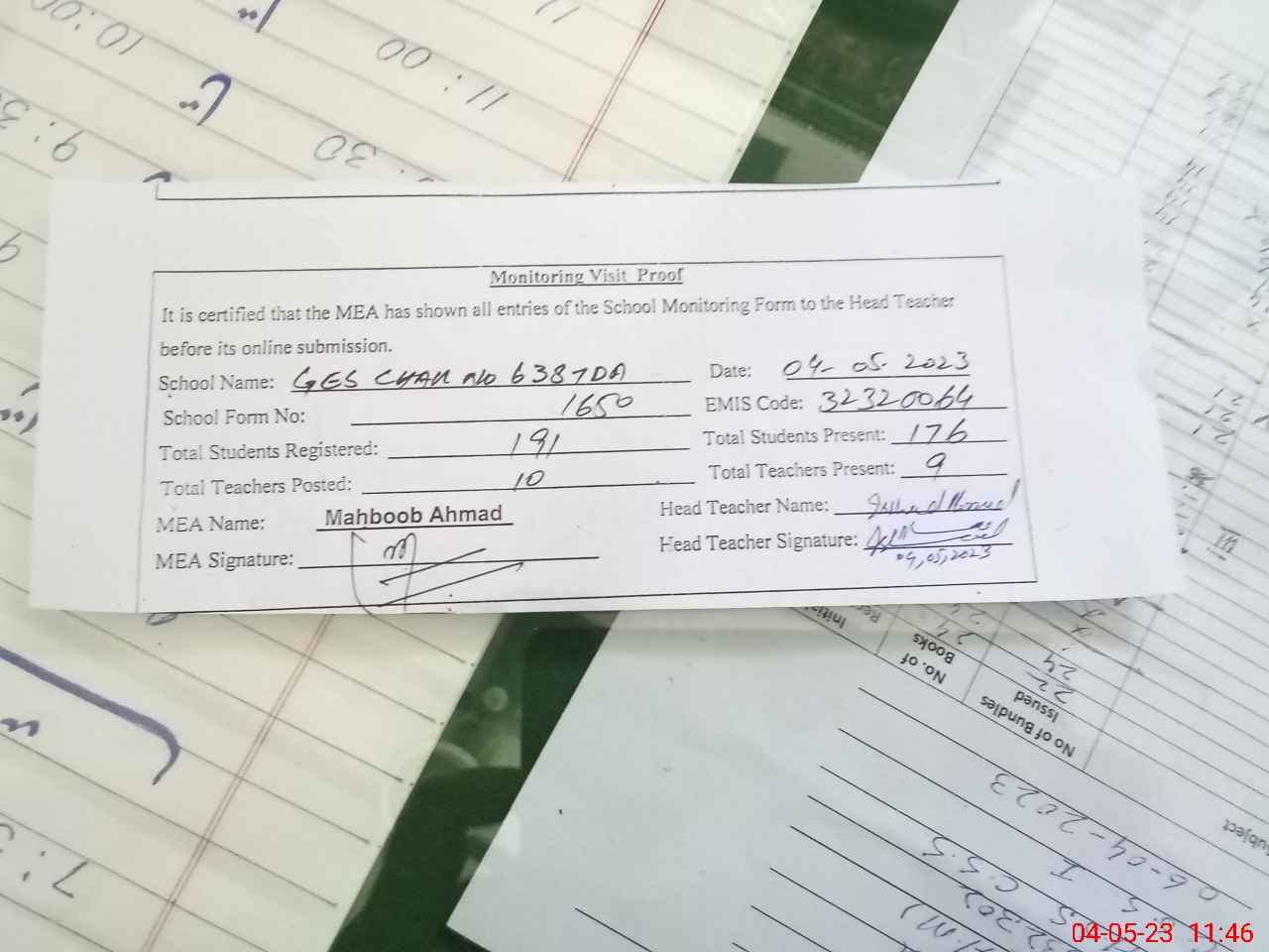| Attendance Register | Head Teacher | MEA with School | Visit Proof |