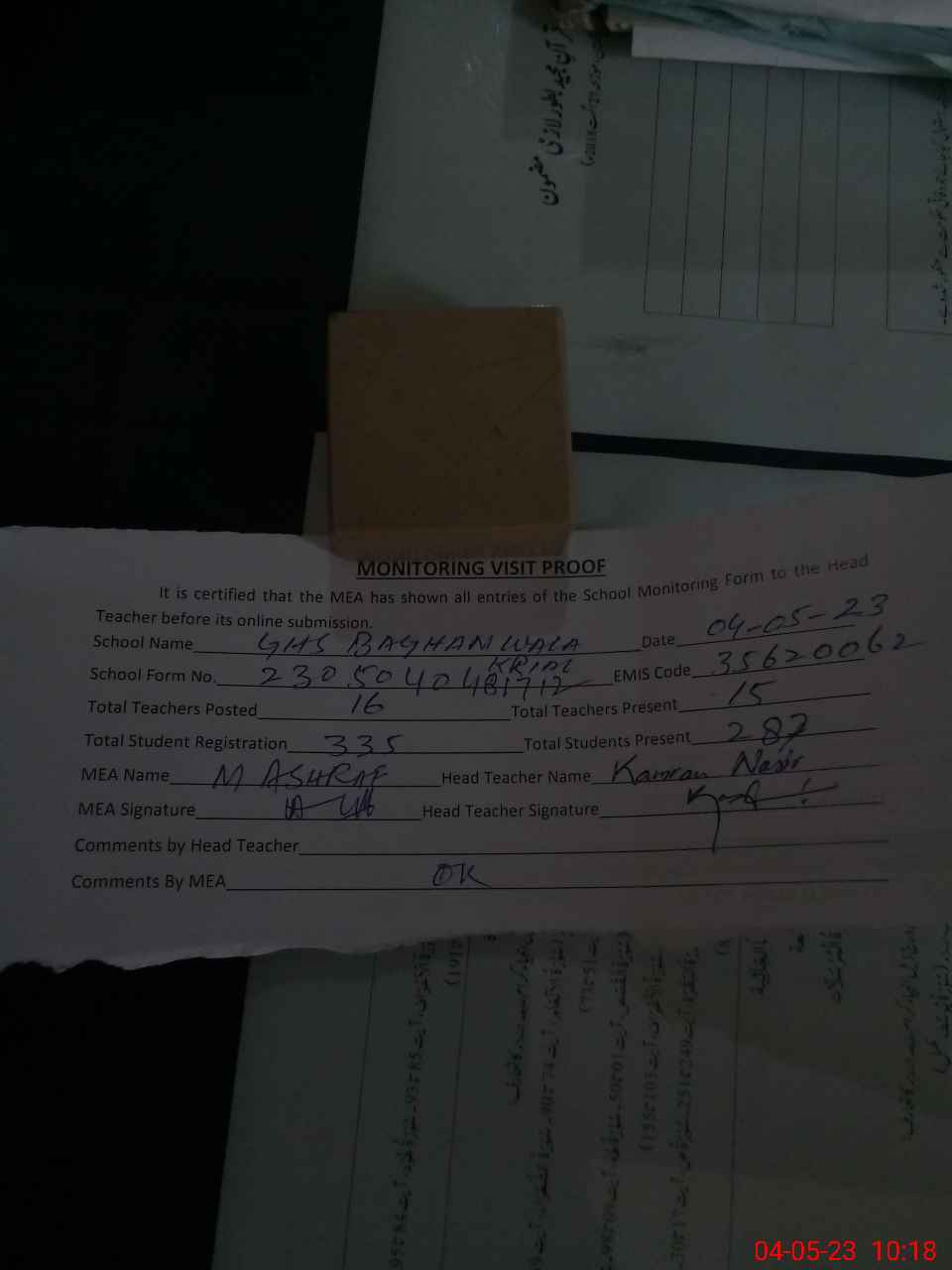 | Attendance Register | Head Teacher | MEA with School | Visit Proof |
