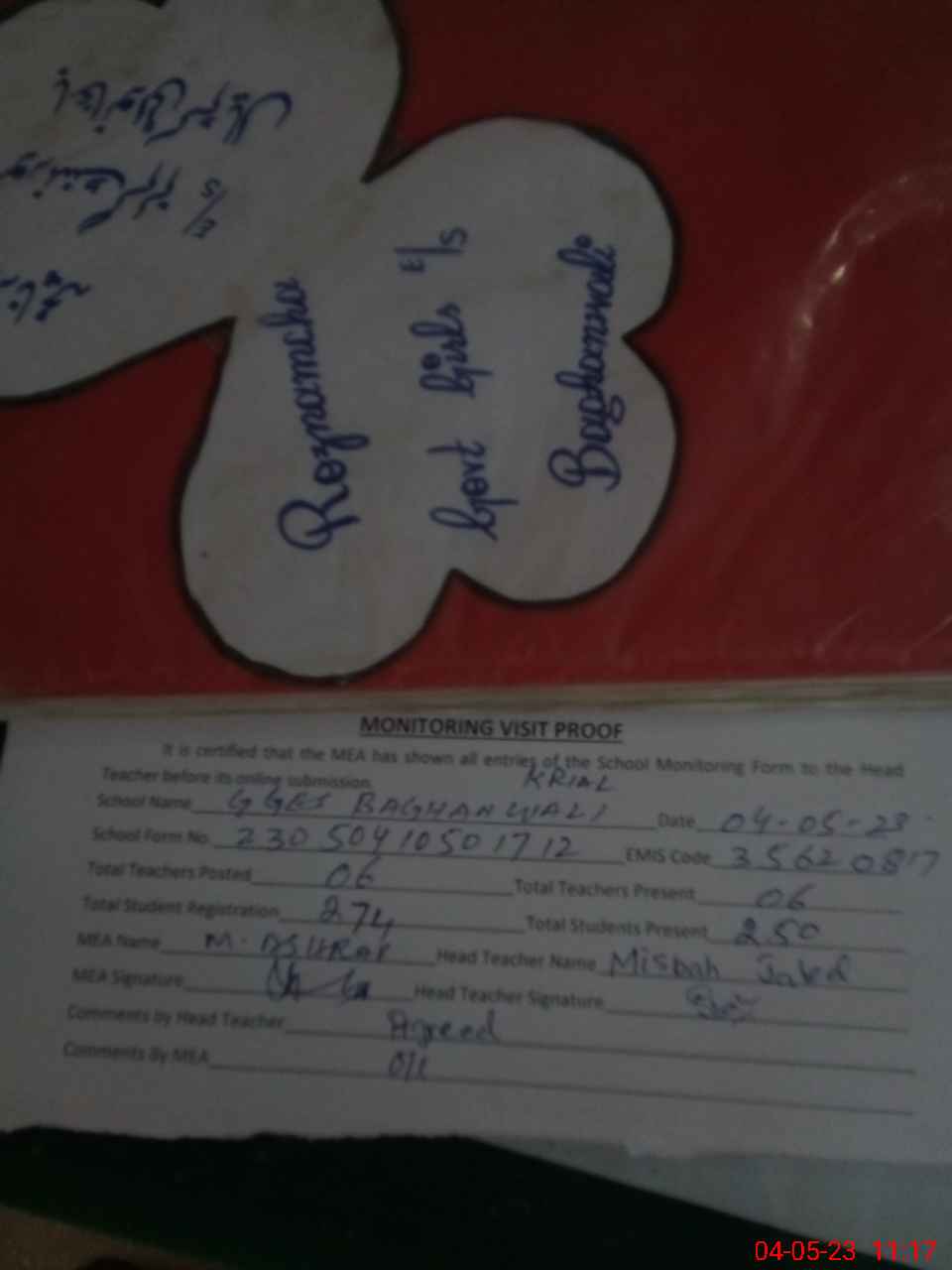 | Attendance Register | Head Teacher | MEA with School | Visit Proof |