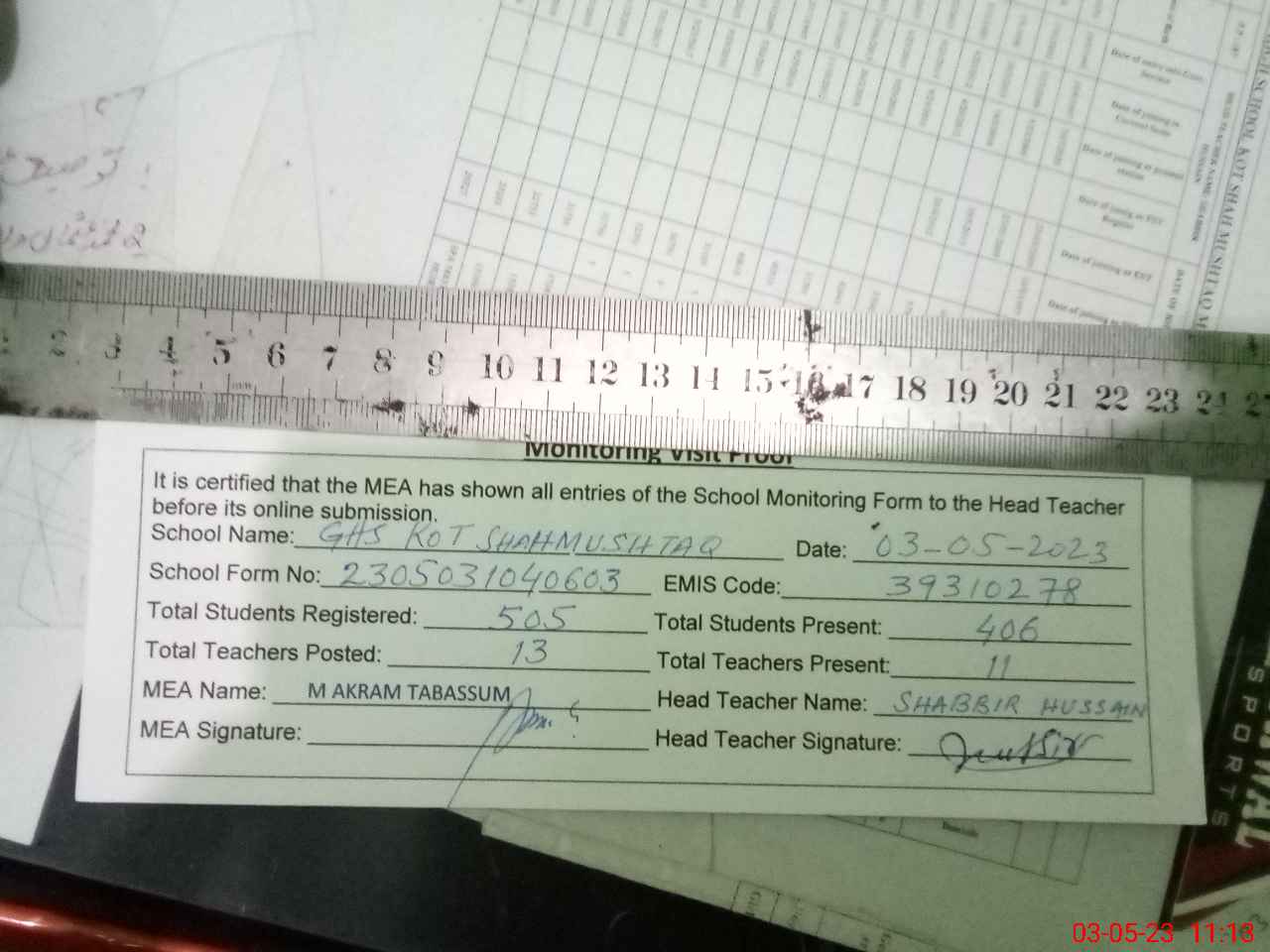 | Attendance Register | Head Teacher | MEA with School | Visit Proof |