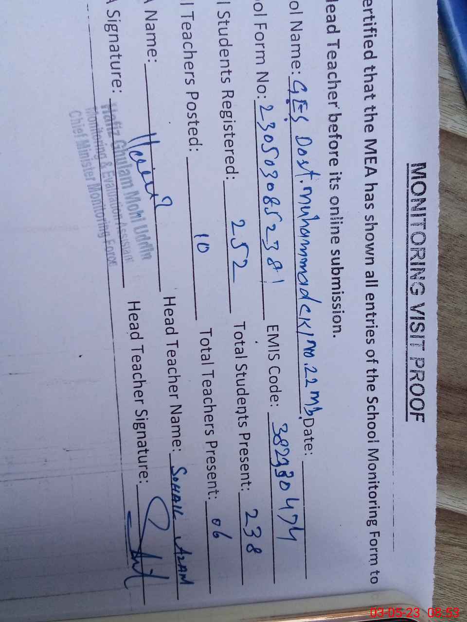 | EMIS Code: 38230474 | Name of School: GES DOST MUHAMMAD CHAK NO. 22 MB | |||