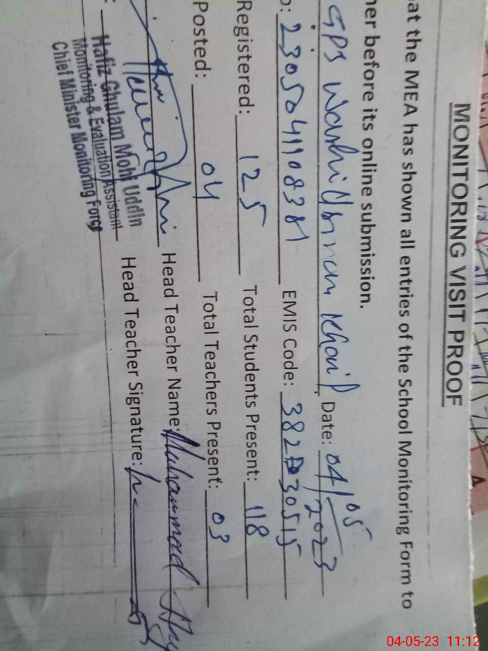| Attendance Register | Head Teacher | MEA with School | Visit Proof |