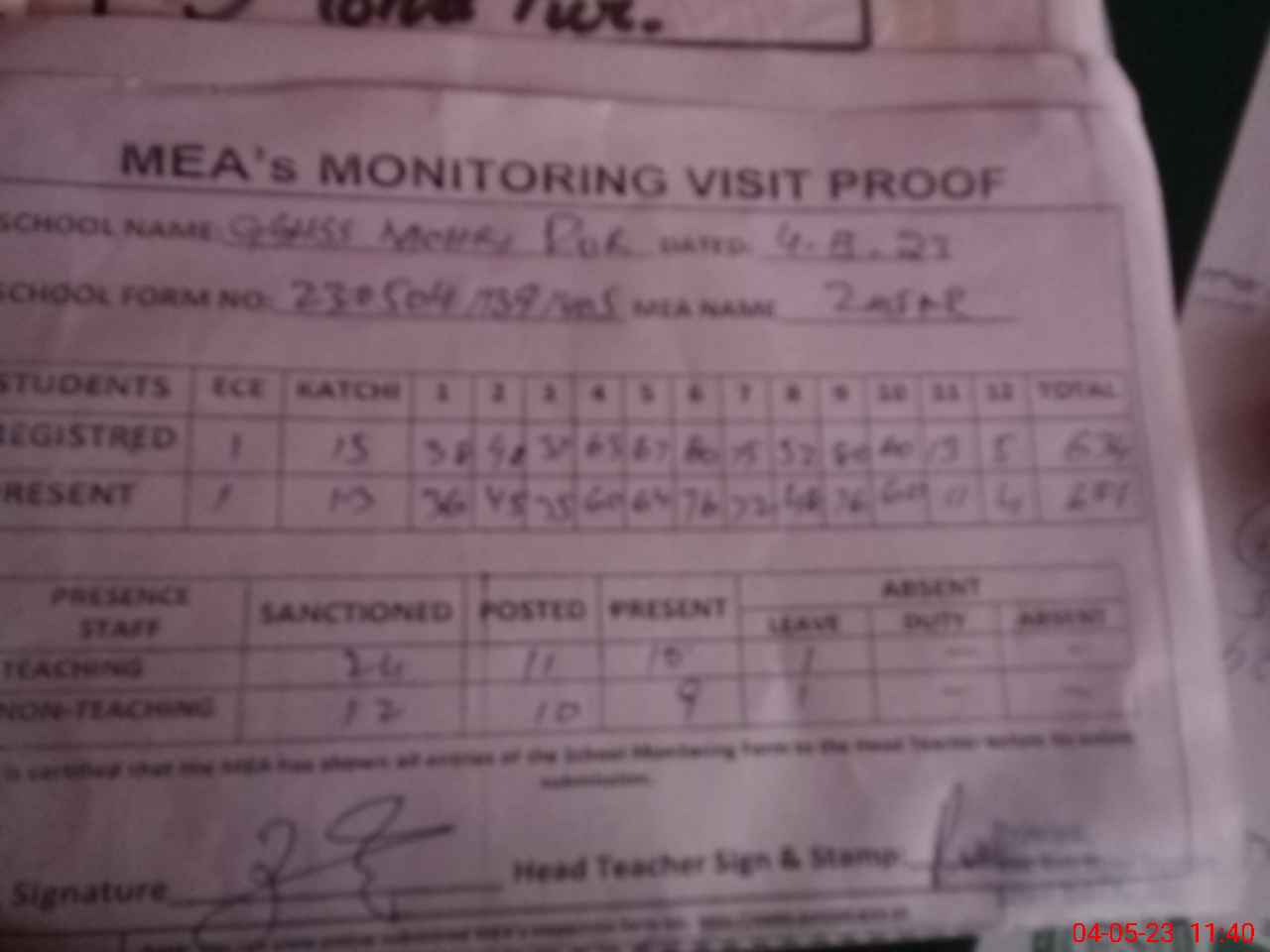 | Attendance Register | Head Teacher | MEA with School | Visit Proof |
