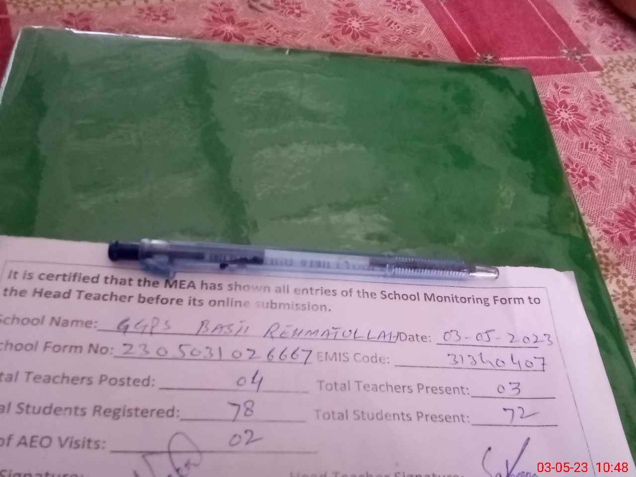 | Attendance Register | Head Teacher | MEA with School | Visit Proof |