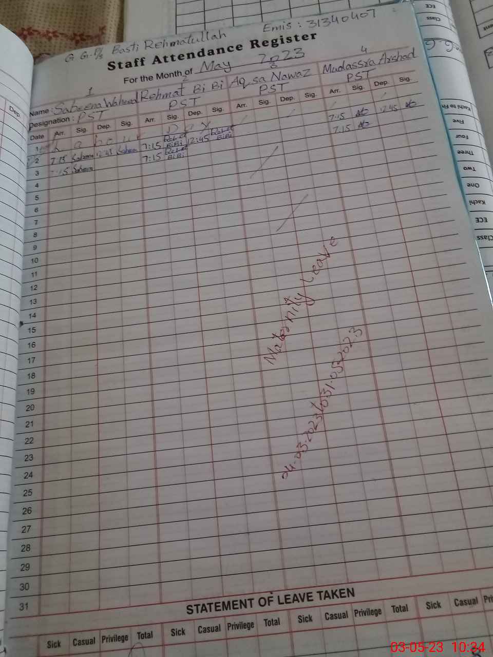 | 36**** | Aq**** Na**** | PST | Regular | 30 | 0 | 0 | 30 | 0 | 0 | 0 | 0 | 0 | Maternity |