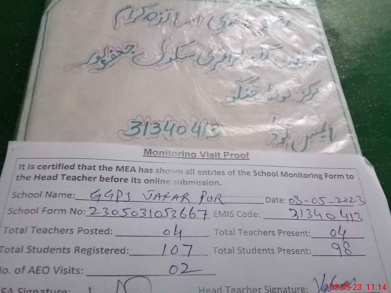 | Attendance Register | Head Teacher | MEA with School | Visit Proof |