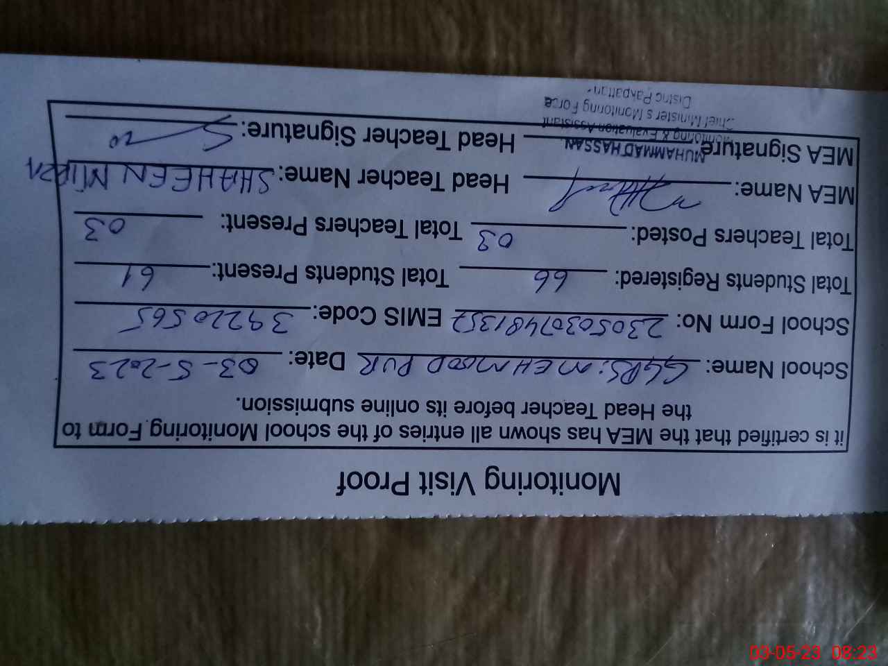 | Certified that this School was Inspected by the Undersigned MEA/DMO Today and the Information Stated Above is as Per Record. | |||||