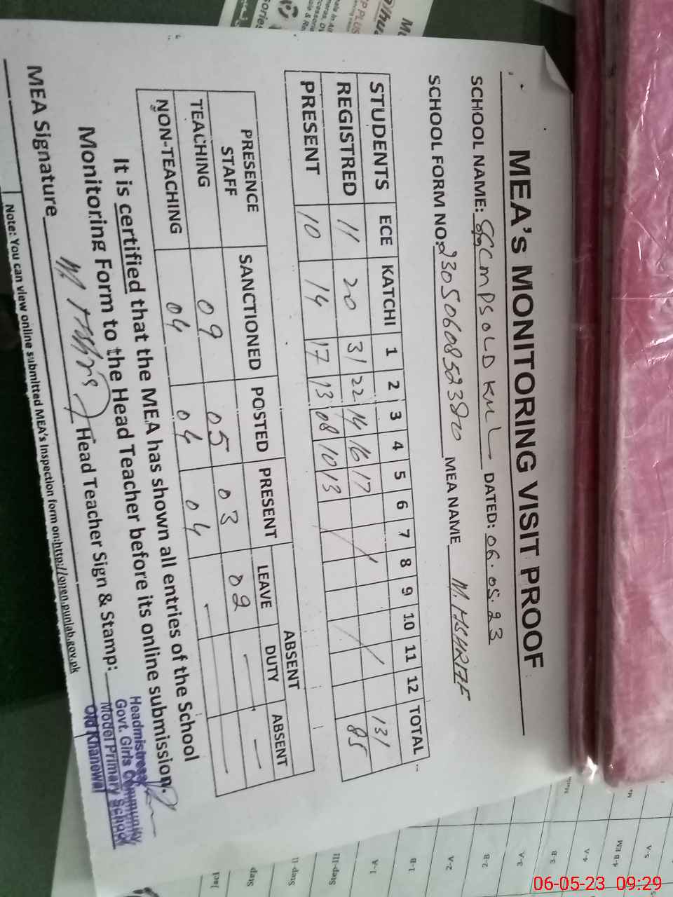 | Attendance Register | Head Teacher | MEA with School | Visit Proof |