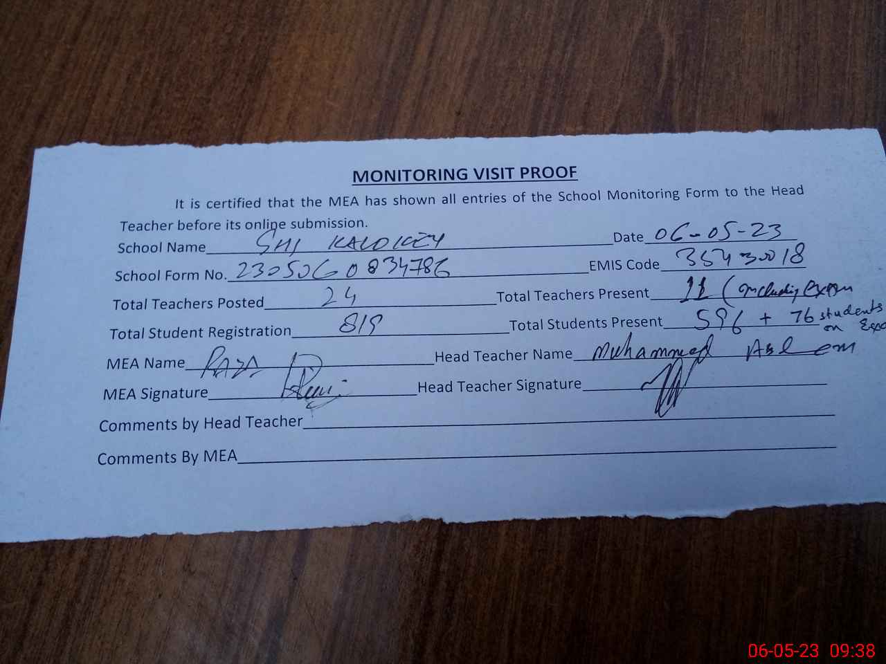| Attendance Register | Head Teacher | MEA with School | Visit Proof |