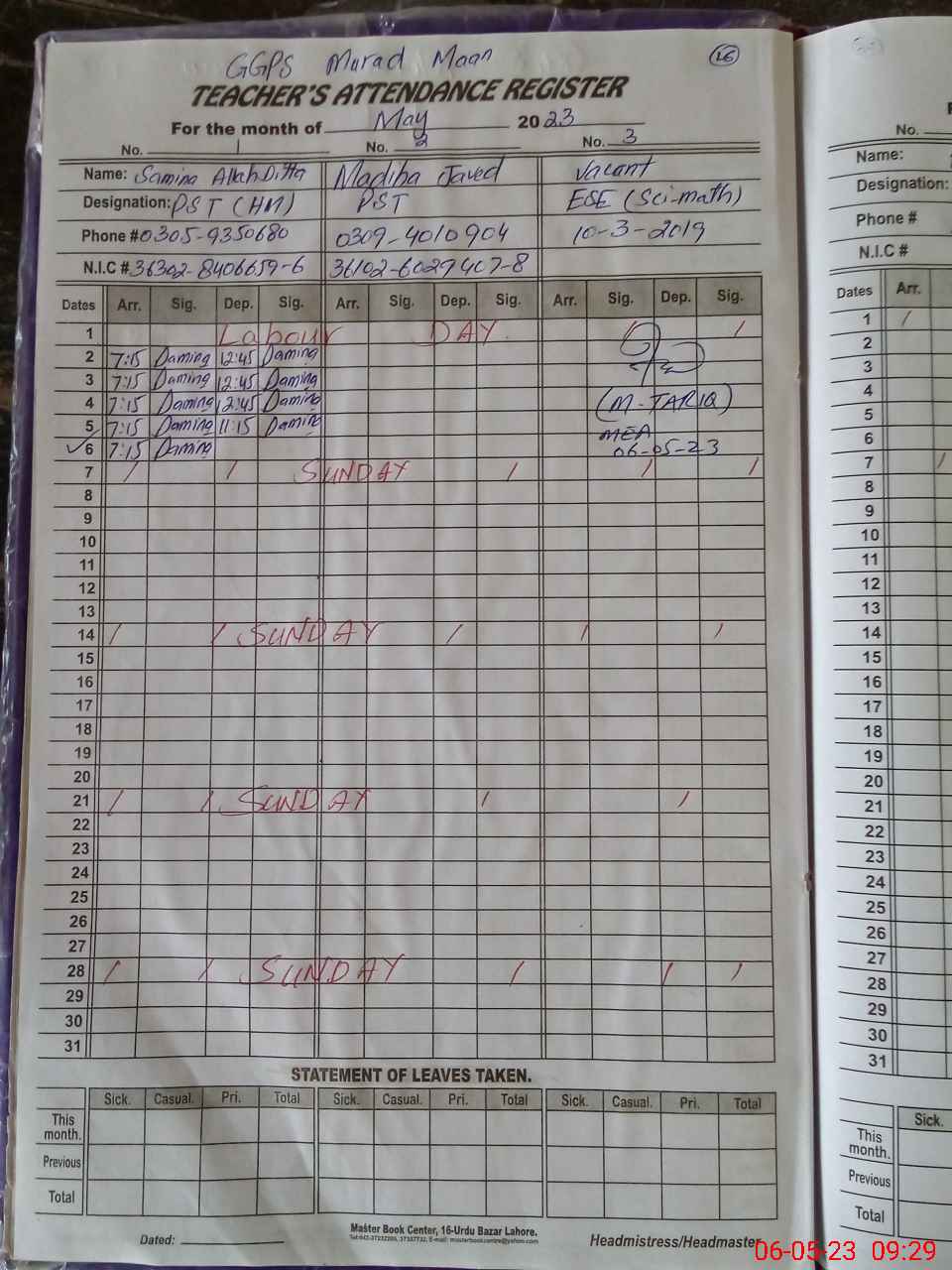 | CNIC | Full Name | Designation | R/C | Absence During Last Calender Month |