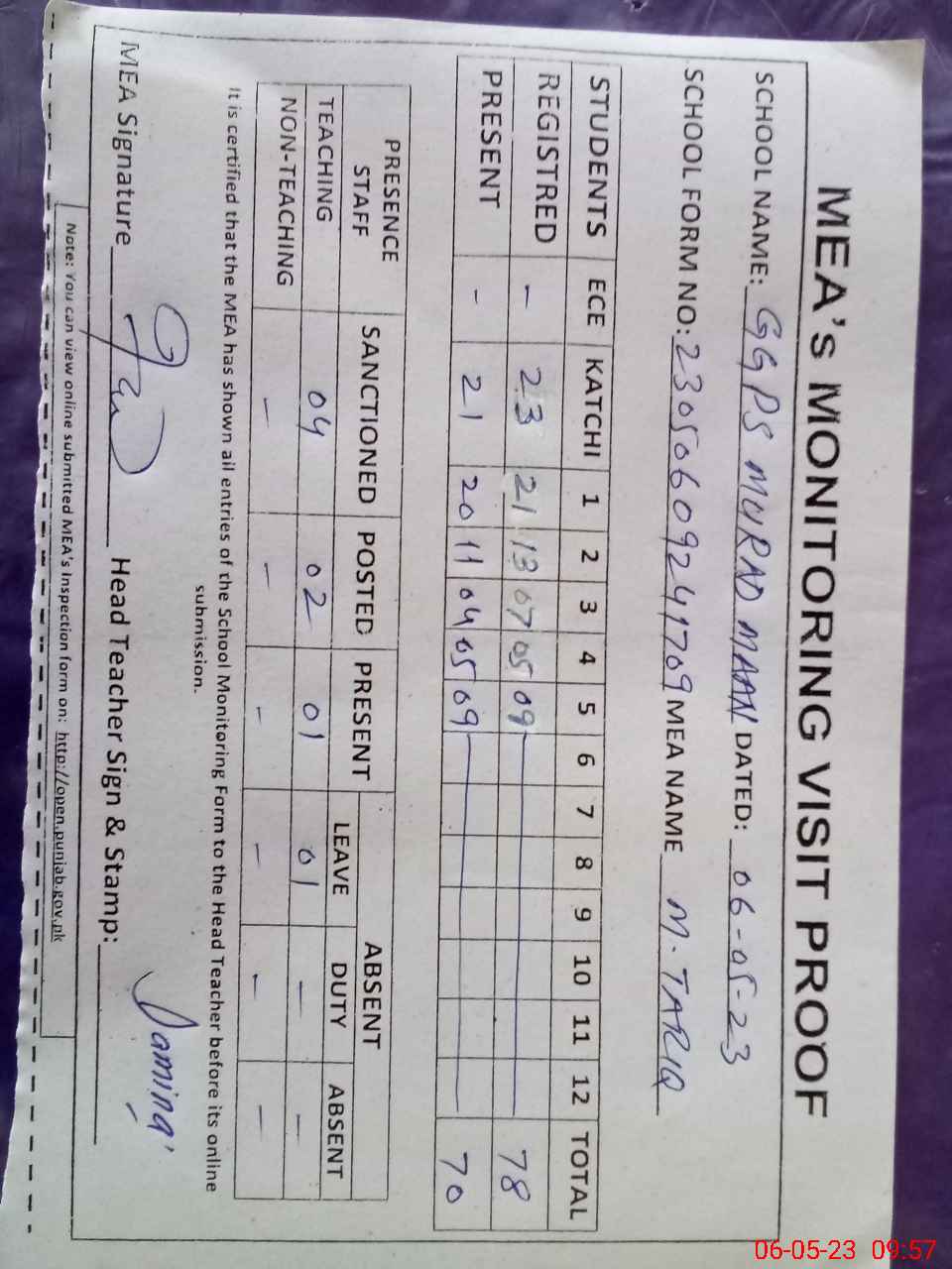 | Attendance Register | Head Teacher | MEA with School | Visit Proof |