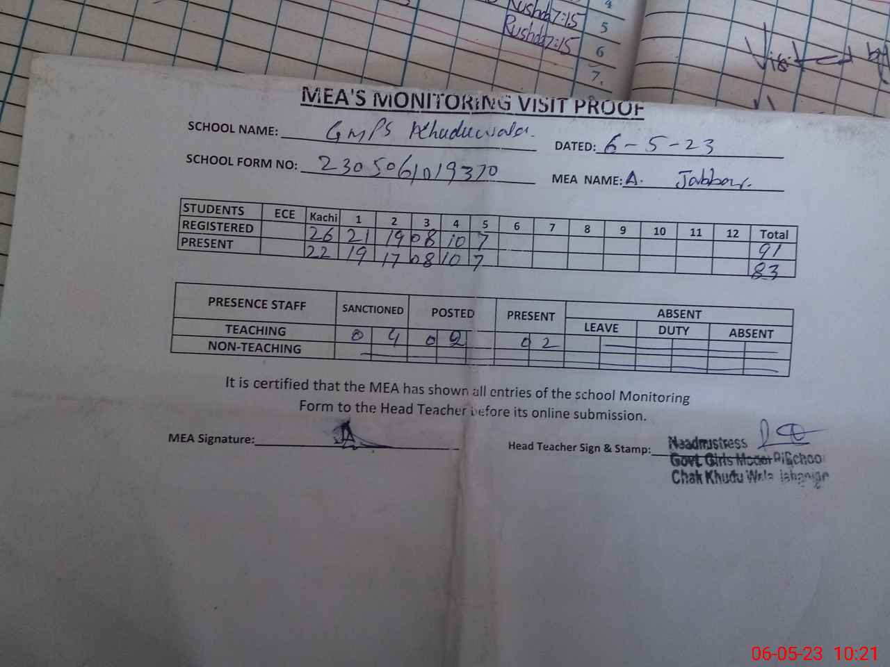 | Attendance Register | Head Teacher | MEA with School | Visit Proof |