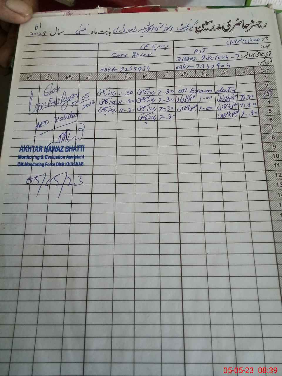 | Name: Mu**** Ra**** Designation: (School Headmaster's/Headmistress's) PST Phone/Cell Number: 03**** |