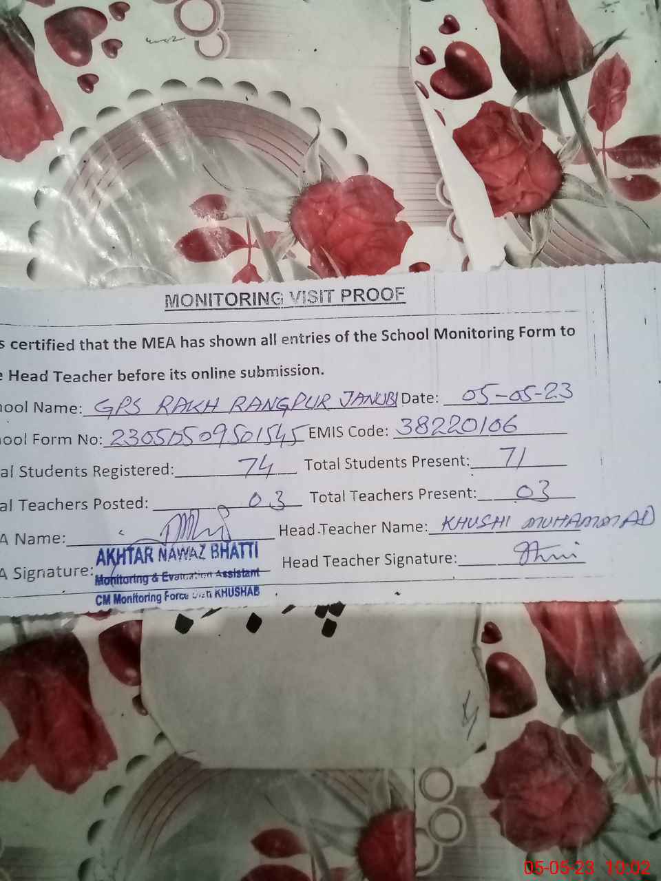 | Monitoring Date: 05-05-2023 | Start Time: 05-05-2023 09:46 AM | End Time: 05-05-2023 10:03 AM | Name of MEA: AK**** NA**** (R**** | |