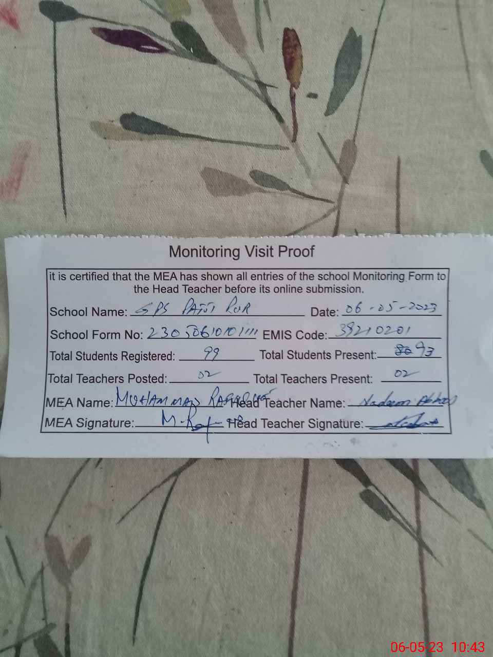 | Attendance Register | Head Teacher | MEA with School | Visit Proof |